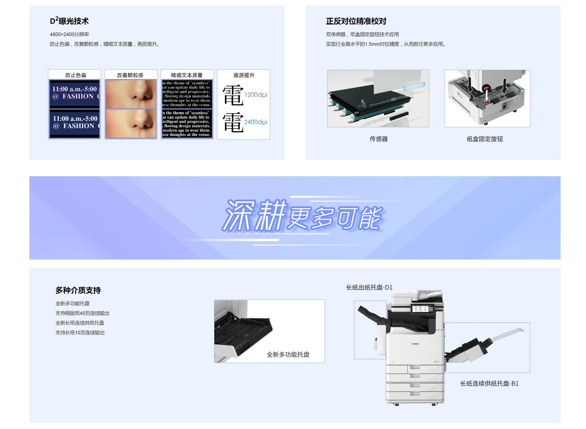 | 供纸量(A4,80 g/㎡) | 标准 | 1200张, 550张*2(纸盒供纸)+100张(多功能托盘) | |