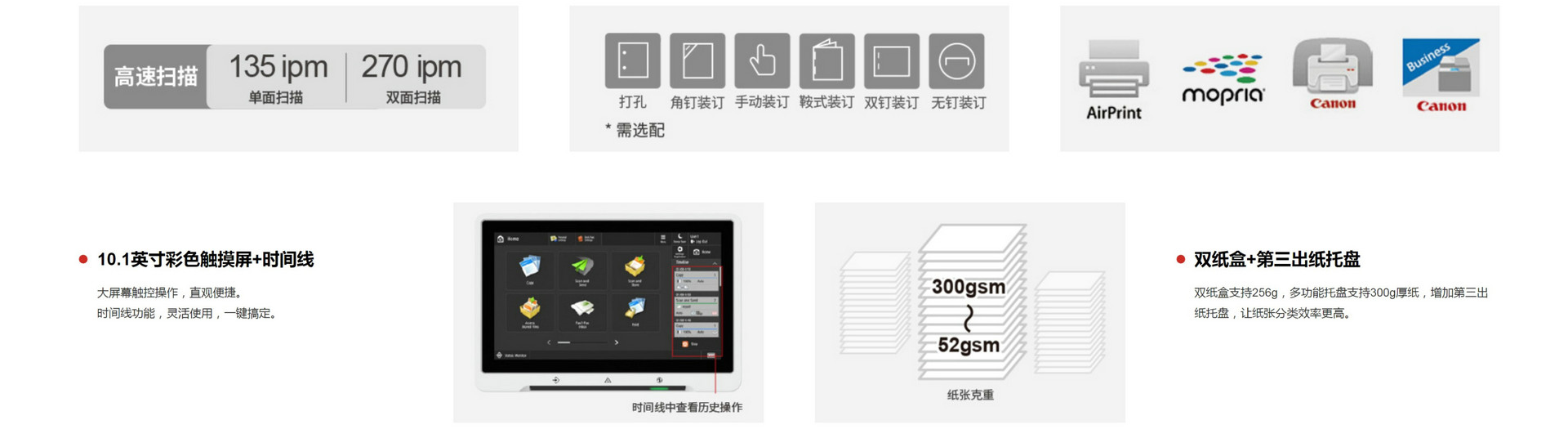 270页/分钟(A4,黑白,300×300dpi) 270页/分钟(A4,彩色,300×300dpi) |