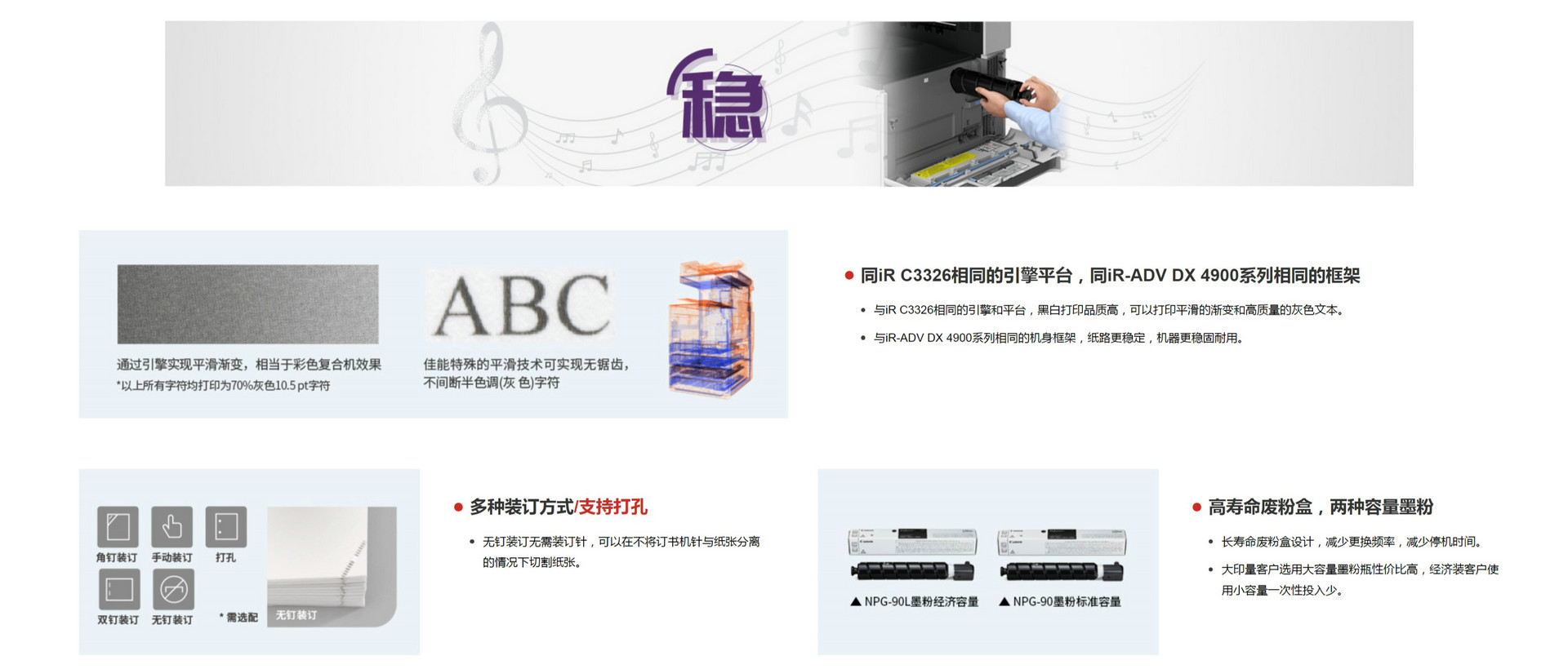 | 供纸量(A4,80gsm) | 标准 | 1200张: 550×2 (前置式纸盒) +100张 (手送纸盘) |