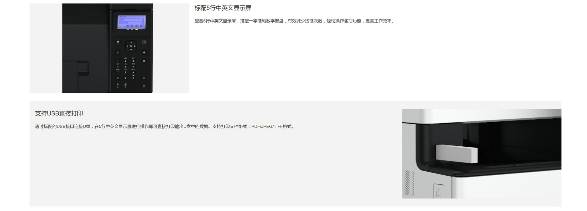 | U盘直接打印 | 支持JPEG, TIFF, PDF格式文件 |