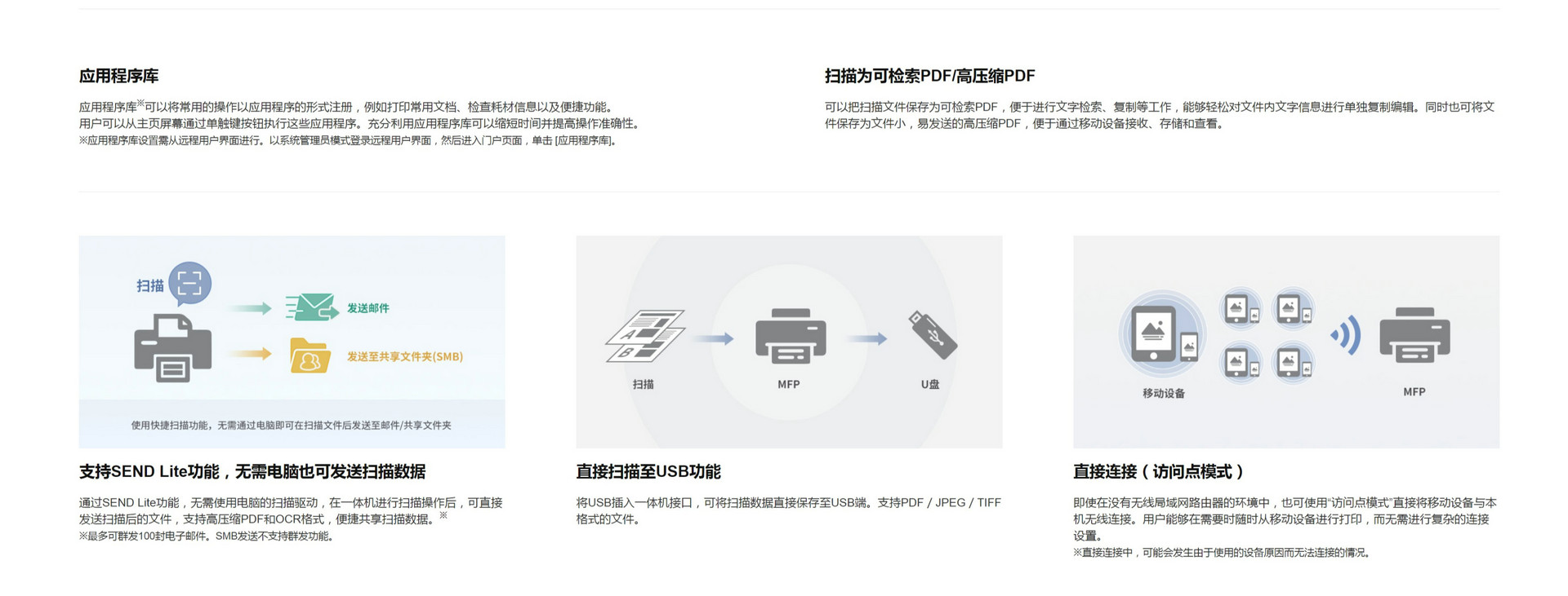 | U盘直接打印 | 支持JPEG, TIFF, PDF格式文件 |