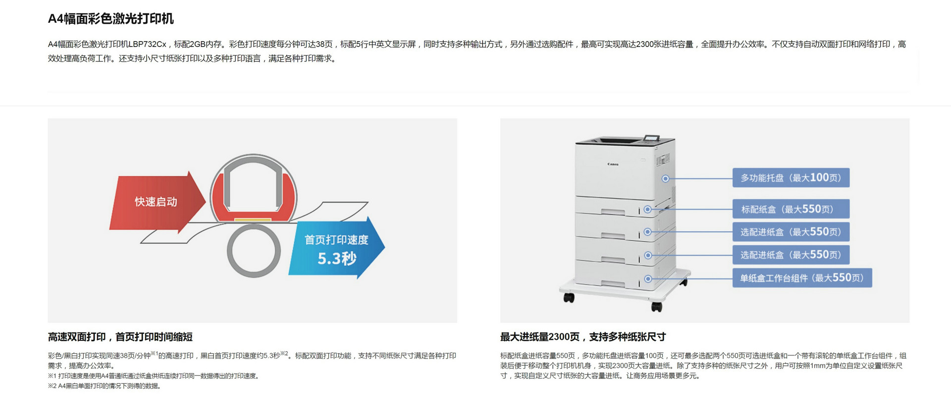 *1 预热时间可能会根据使用条件(如所使用的硒鼓、菜单设置、选配附件的可用性以及安装环境)而有所变化。首页打印 & 复印时间基于A4/面向下输出,可能会根据所使用的硒鼓或输出的环境而有所变化。