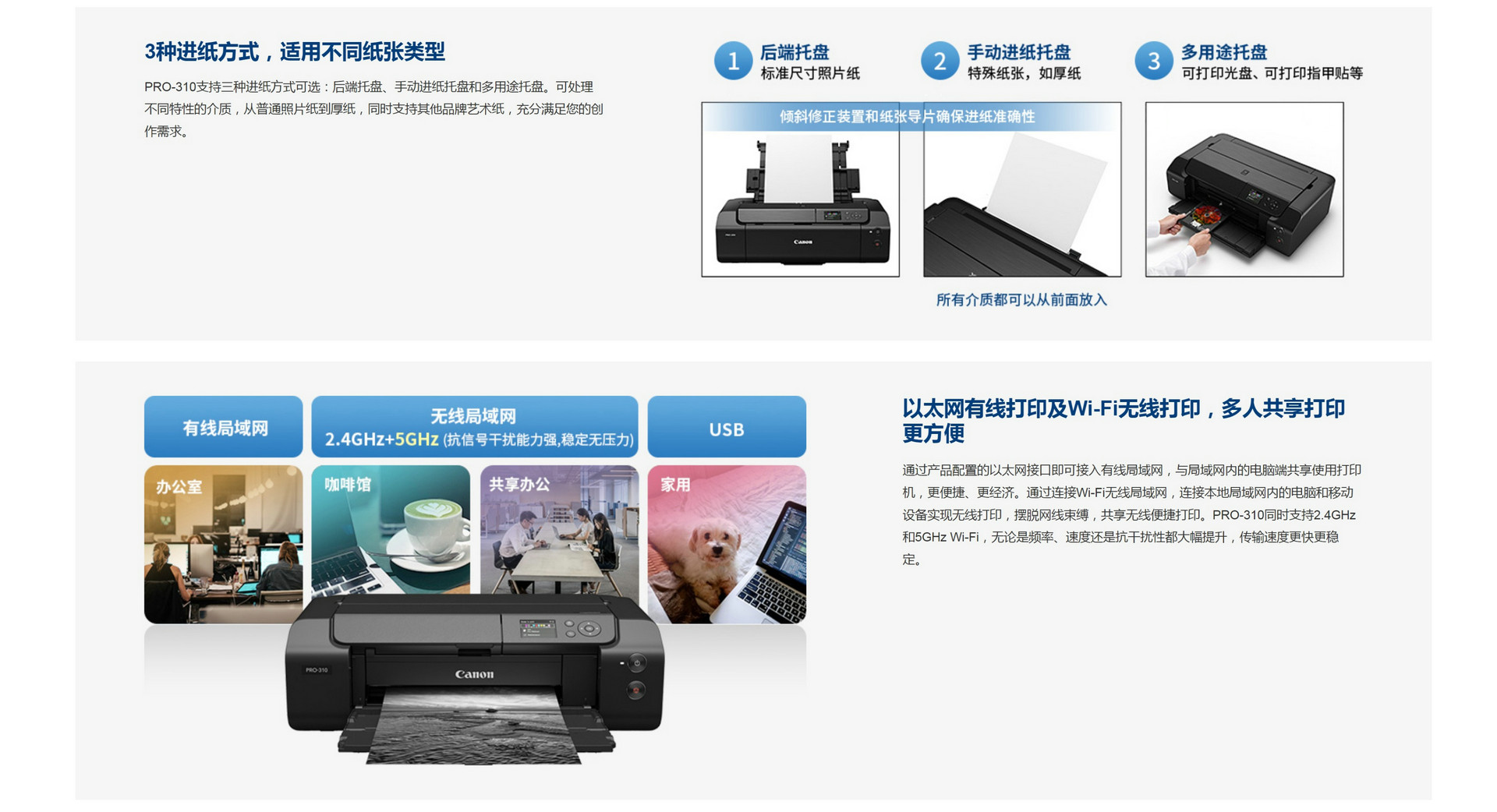 | 支持纸张 | 上端进纸盘 | 普通纸/优质专业照片纸/专业绒面照片纸/高级光面照片纸/无光泽照片纸/Hagaki/亚高光泽照片纸/轻质照片纸/重磅艺术纸/日本和纸/油布/照片纸 (灰度打印)/照片纸(长格式打印)/艺术纸 (长格式打印)/贺卡 | |