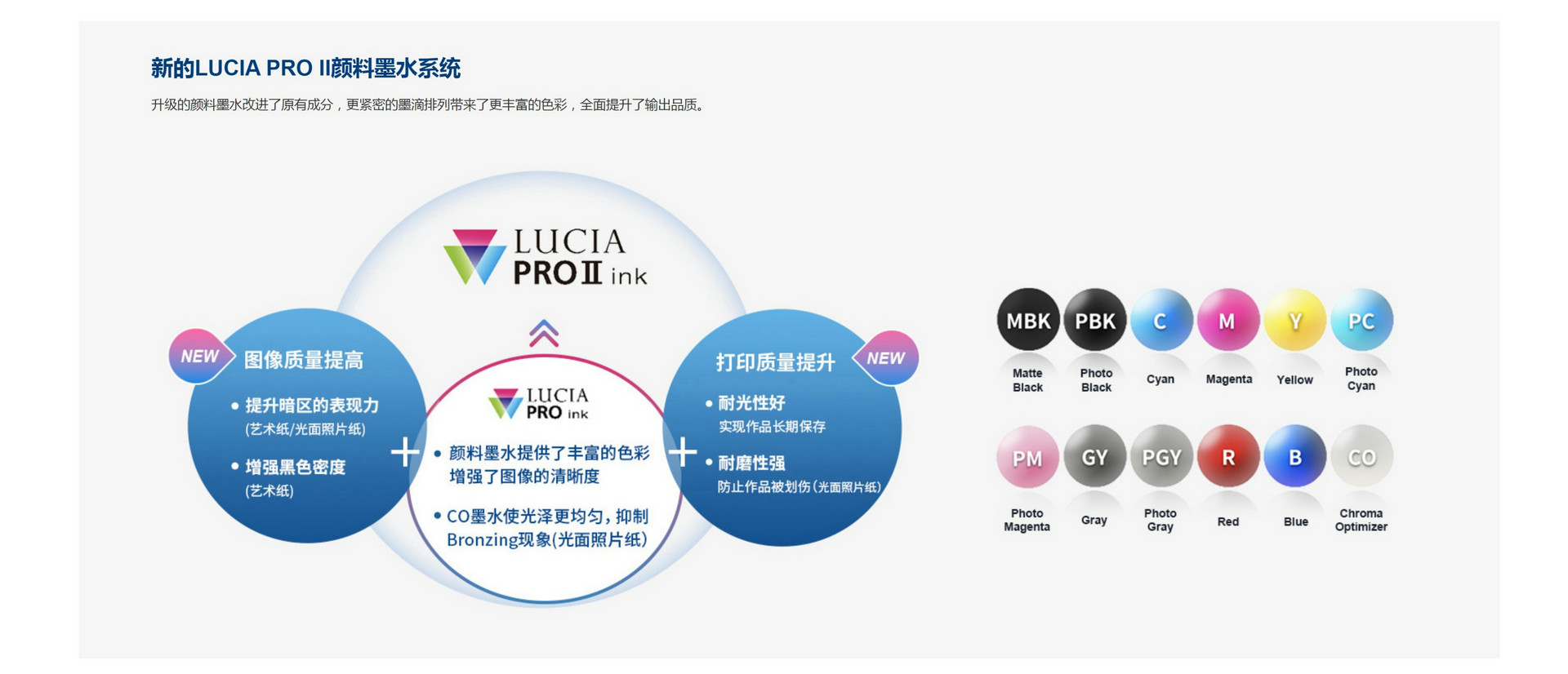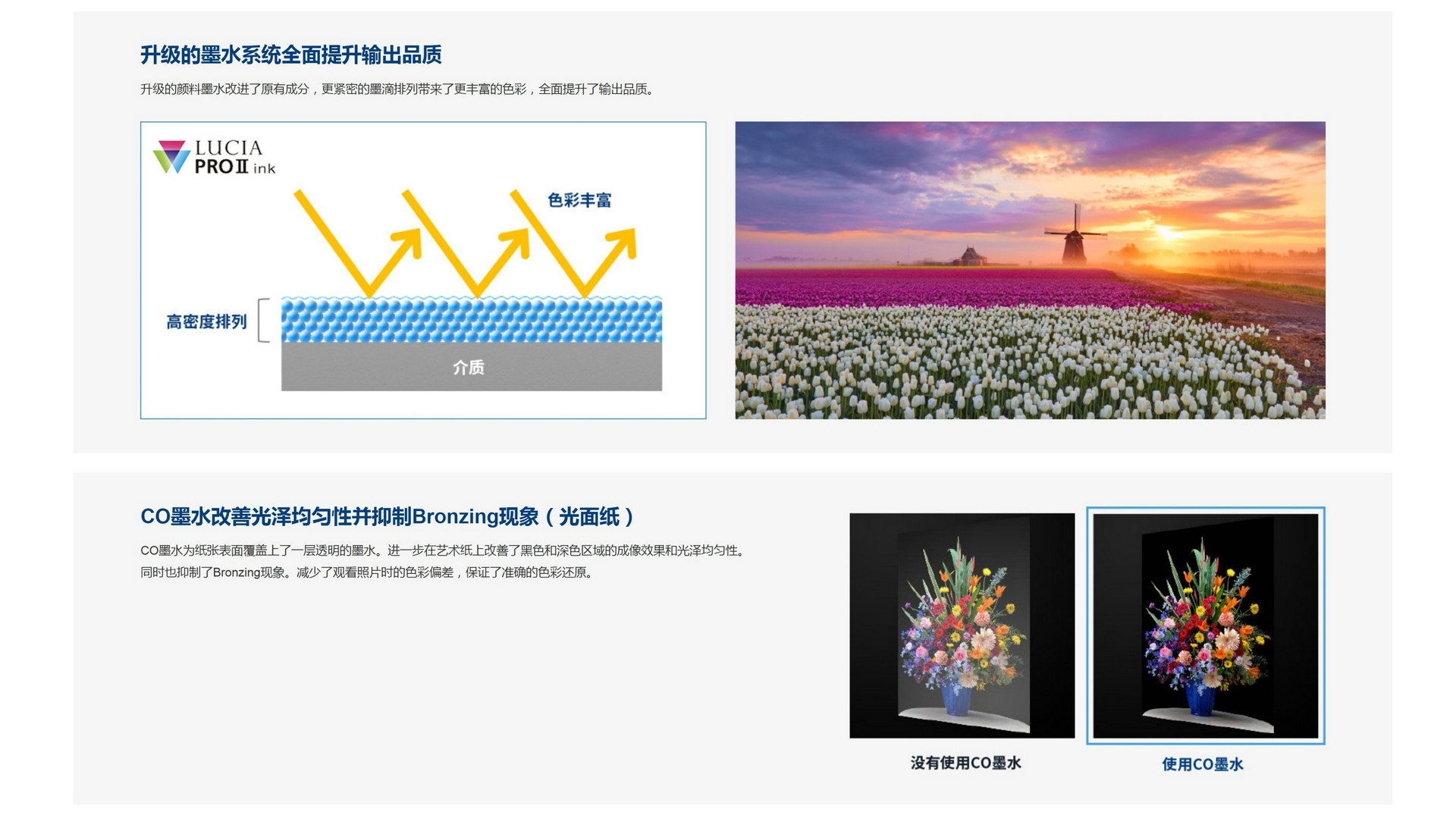9).CO(晶亮色)墨水用于调节照片纸表面的光泽度。即使CO墨水没有直接应用在照片纸上,为了确保打印机以及打印品质仍然会使用到CO墨水。