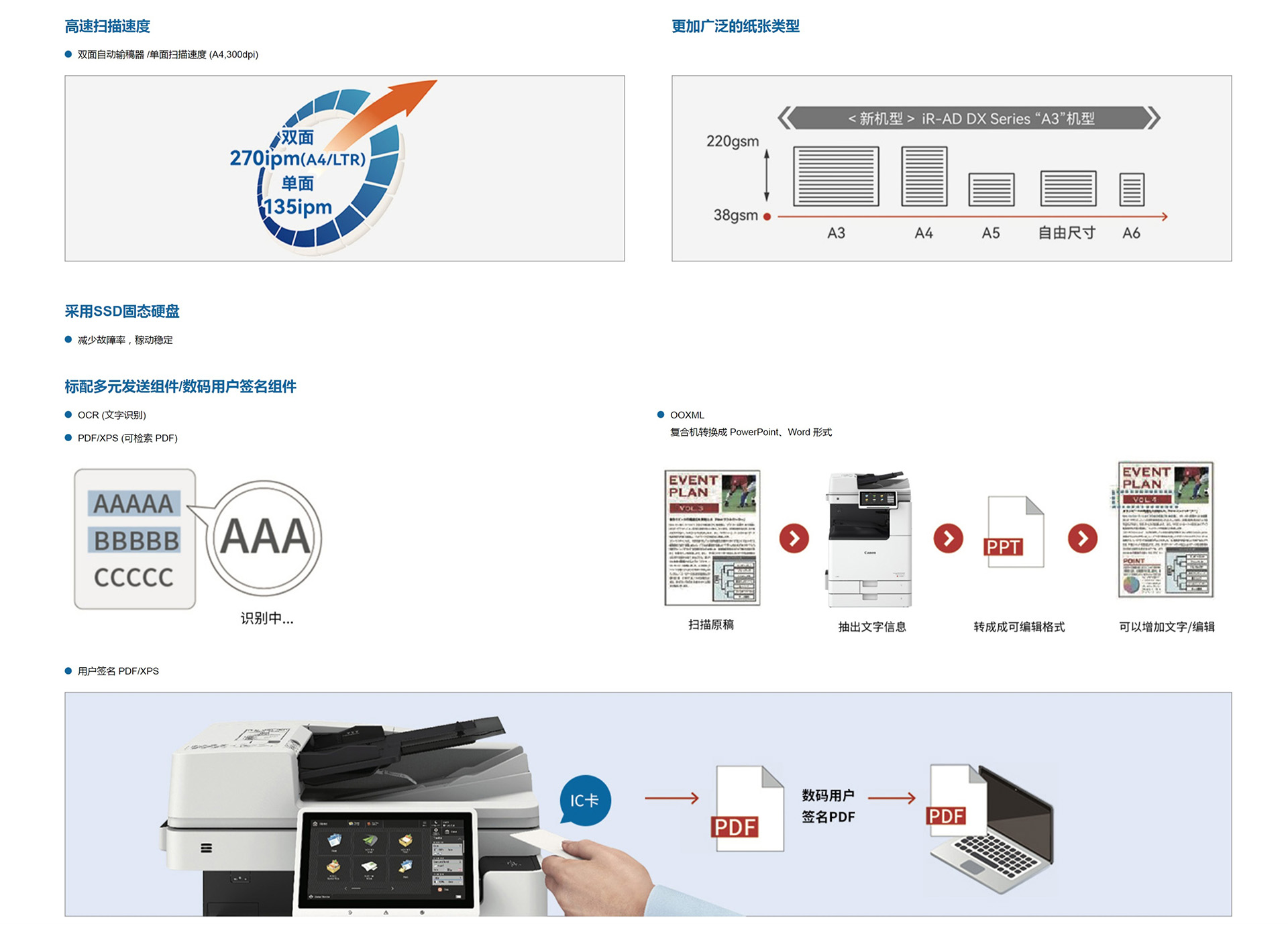 | 原稿扫描速度 | 单面: 70/70 (300 x300 dpi, send), 51/51 (600 x600 dpi, copy) | |