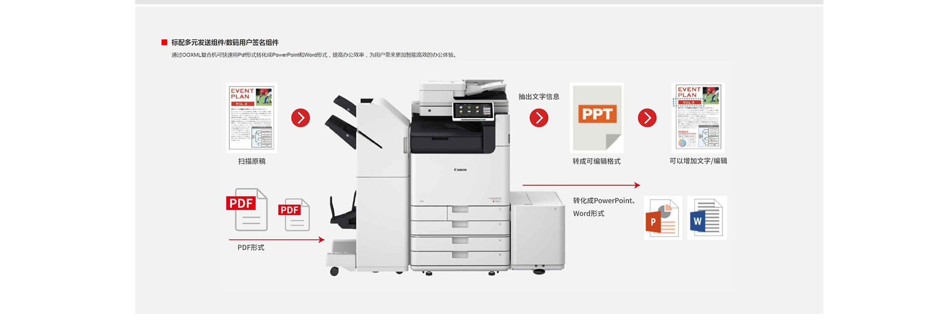 TIFF (MMR)、JPEGx1、PDF(压缩、OCR(可检索文本)、优化最适合网络的PDF、将格式更改为PDF/A、轮廓、加密)、 XPS(压缩、OCR(可检索文本))、PDF/XPS (设备签名、用户签名)、Office Open XML (PowerPoint, Word) |
