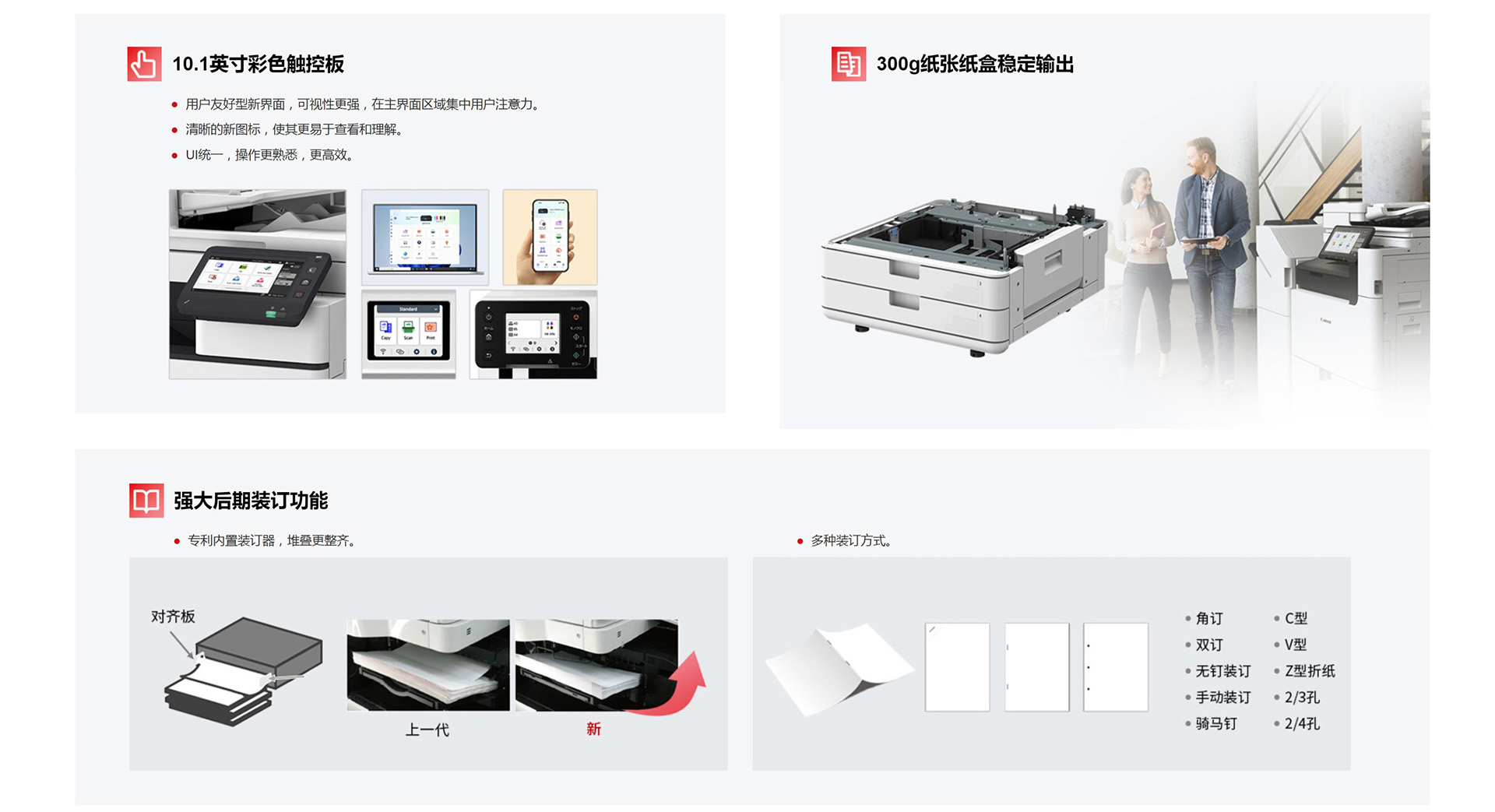 | 供纸量(A4,80gsm) | 标准 | 1200张 ,550张x2(纸盒供纸)+100张(多功能托盘) |