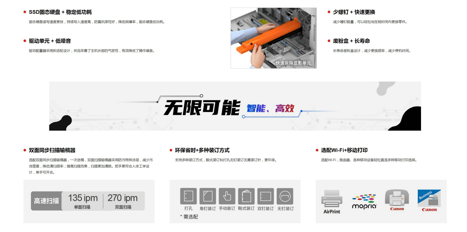 | 基本配置/选购件 | 复印 | 网络打印 | 彩色网络扫描双面 | 彩色发送 | 传真 | 稿台盖板 | 双面同步扫描输稿器 |