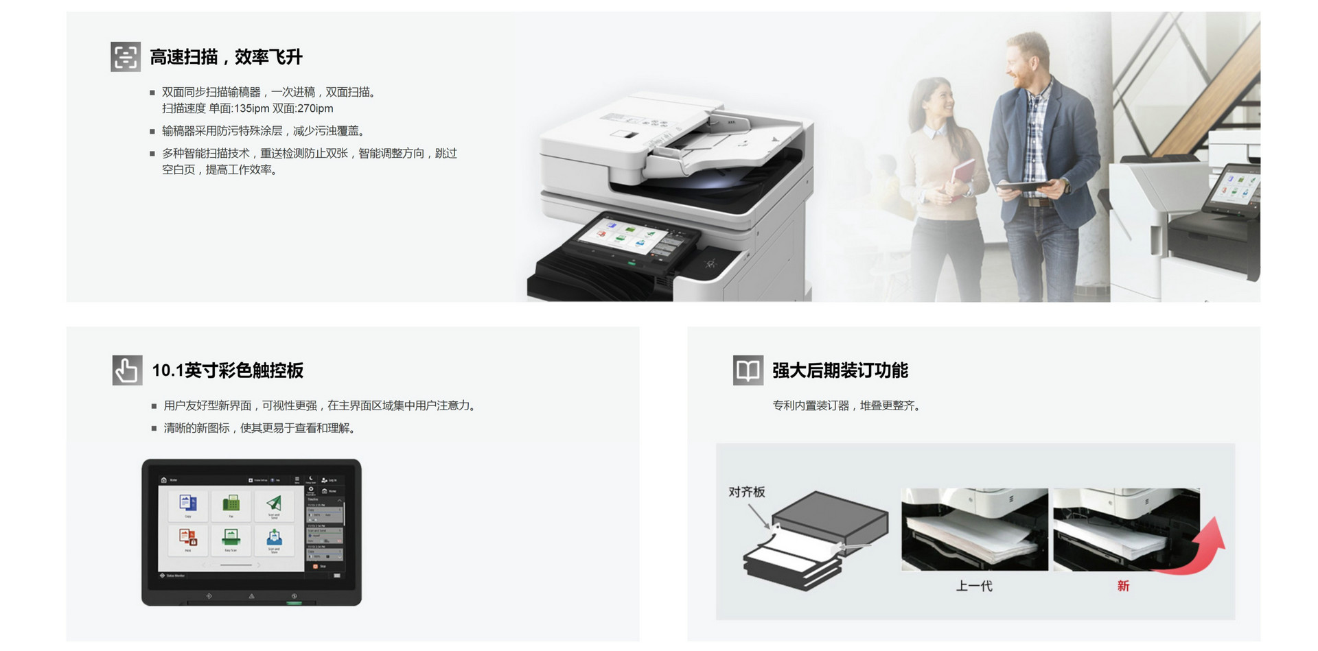 | 扫描速度 | 黑白/彩色,A4 | 单面扫描: 135/135ipm(300×300dpi,发送), 80/80ipm(600×600dpi,复印) | |