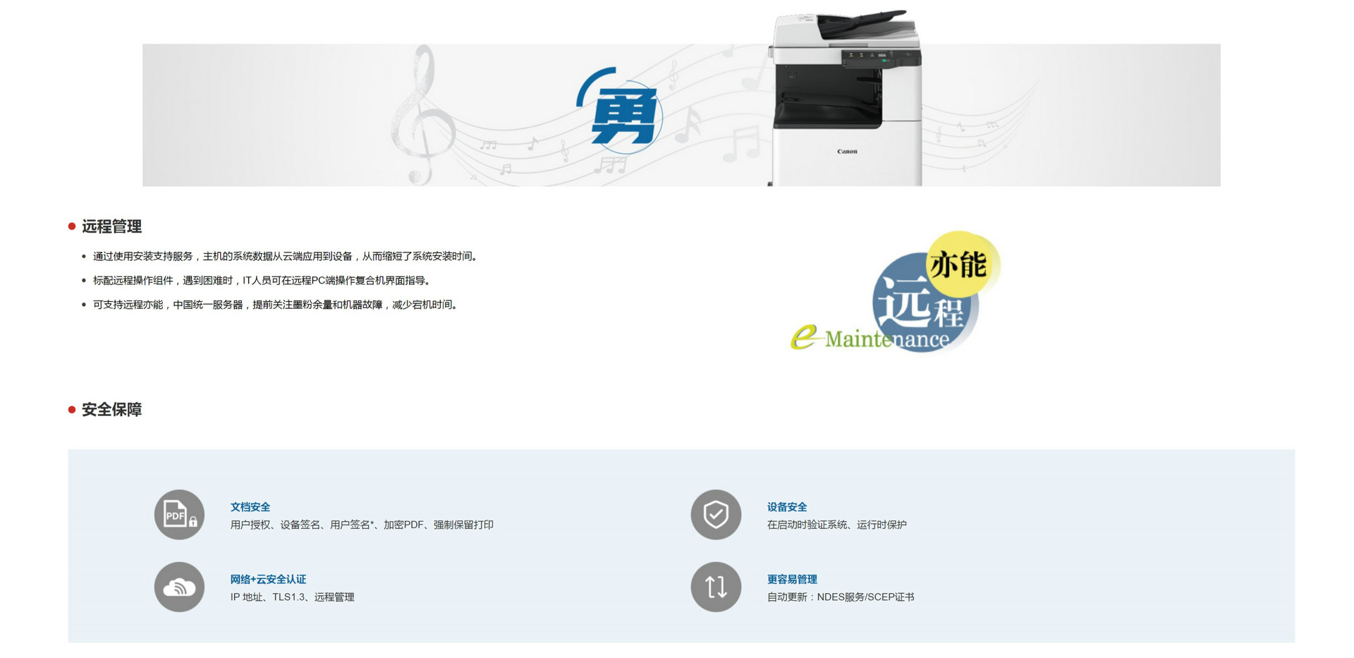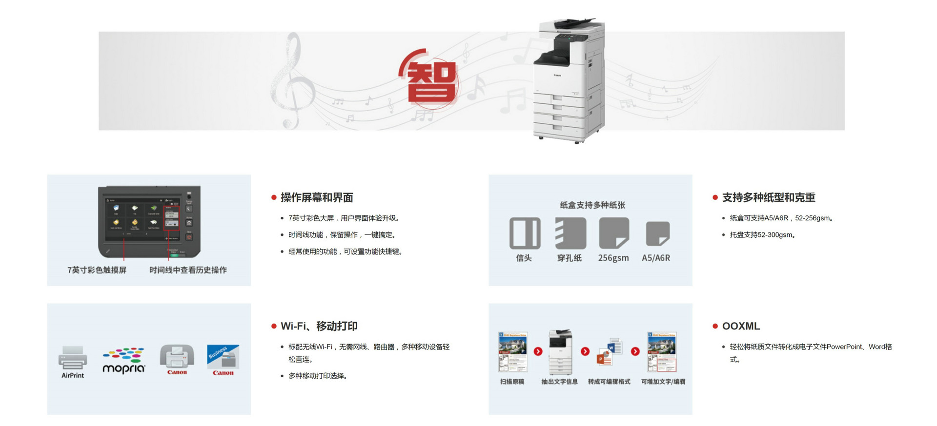 | 供纸量(A4,80gsm) | 标准 | 1200张: 550×2 (前置式纸盒) +100张 (手送纸盘) |